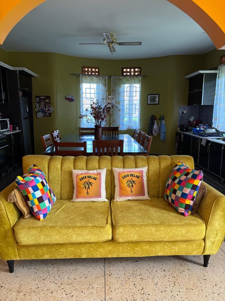 Our villa in Bwerenga offers a large, open-plan kitchen and dining area, perfect for families or groups. The stunning marble dining table seats up to ten guests comfortably, making it ideal for shared meals and gatherings.